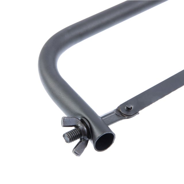 Міцна металева рамка має високу жорсткість, що забезпечує швидке розпилювання металу. Конструкція з надійним кріпленням полотна, затягується та фіксується за допомогою спеціального гайкового механізму. Встановлення полотна можливе під кутом 90°.