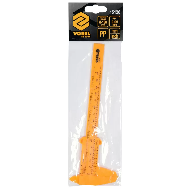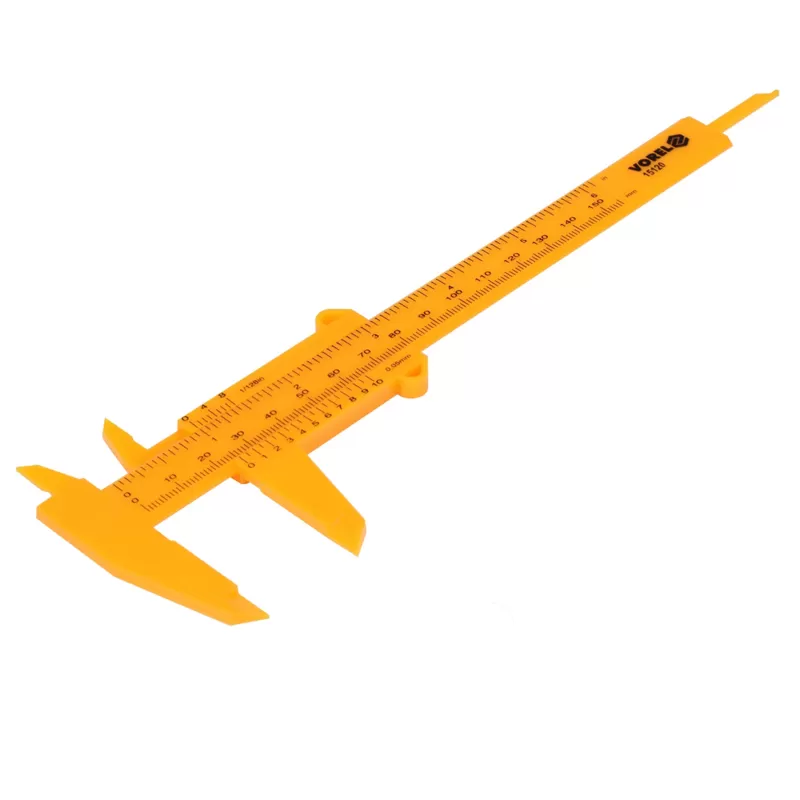 Штангенциркуль VOREL 15120 – класичний штангенциркуль з додатковою шкалою (верньєром), яка збільшує точність вимірювання. Призначений для внутрішніх та зовнішніх вимірювань, вимірювання висоти та глибини. Виготовлений з пластику. Дозволяє проводити вимірювання в діапазоні від 0 до 150 мм з точністю 0,05 мм.