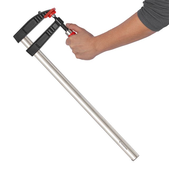 Основа виконана з міцної сталевої напрямної, ручка – дерев’яна. Завдяки пластиковому наконечнику на затискних губках гарантований захист деталей, що затискаються, від механічних пошкоджень, подряпин.