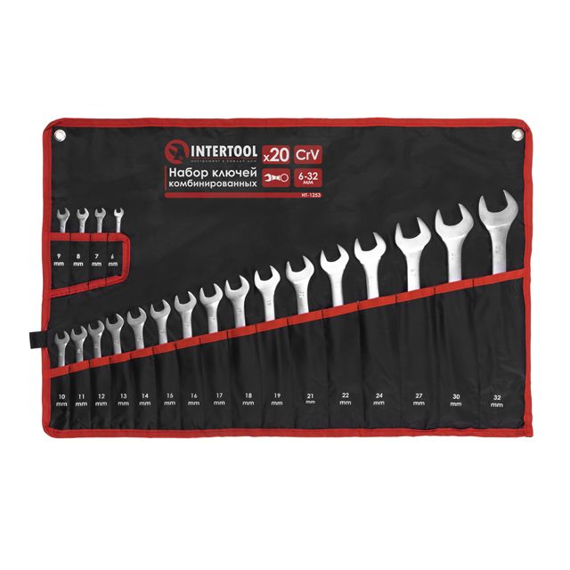 До набору INTERTOOL HT-1253 увійшли ріжково-накидні ключі, розмірами: 6, 7, 8, 9, 10, 11, 12, 13, 14, 15, 16, 17, 18, 19, 21, 22, 24, 27, 30, 32 мм. Це дозволяє обрати необхідний розмір під будь-які завдання для монтажу та демонтажу різьбових з’єднань гайок та болтів.