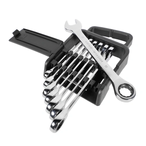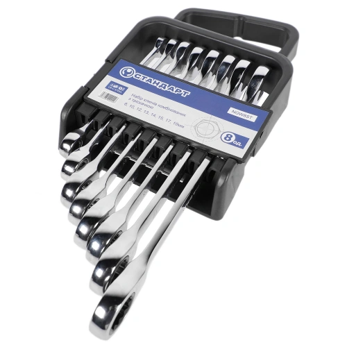 ГоловнаІнструменталканабори ключів комбінованих з тріскачкоюНабір ключів комбінованих з тріскачкою 8,10,12-15,17,19мм 8ед. на холдері СТАНДАРТ NGW8ST