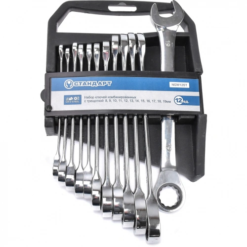 ГоловнаІнструменталканабори ключів комбінованих з тріскачкоюНабір ключів комбінованих з тріскачкою 8-19мм 12ед. на холдері СТАНДАРТ NGW12ST