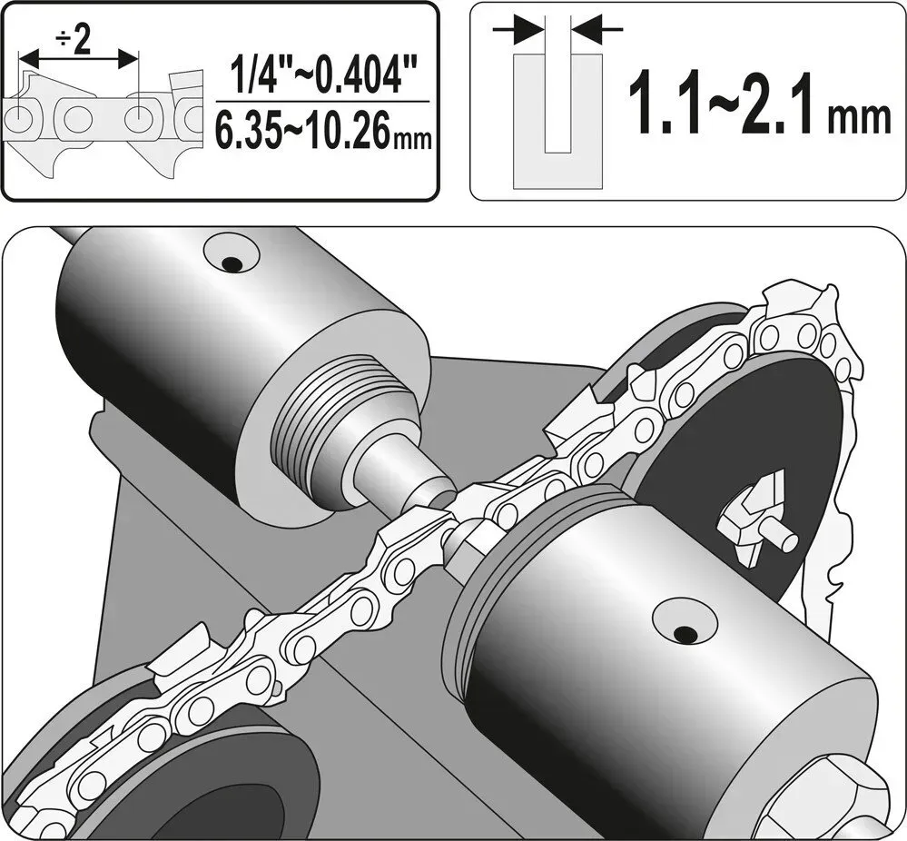 Обжимний апарат YT-84970 призначений для точної клепки бензопили. Завдяки використанню змінних наконечників можна оптимально підібрати ланцюги різної товщини і кроку. Вони дозволяють обжимати ланцюга на барабанах YATO, а також обслуговувати ланцюги YATO і інших виробників.