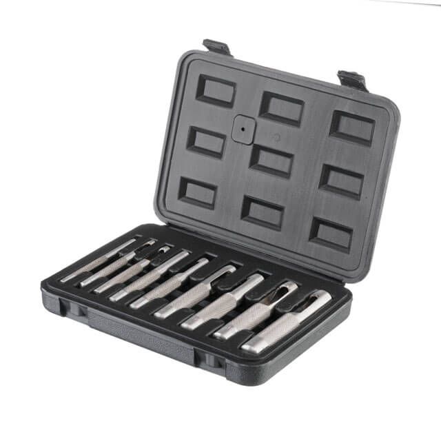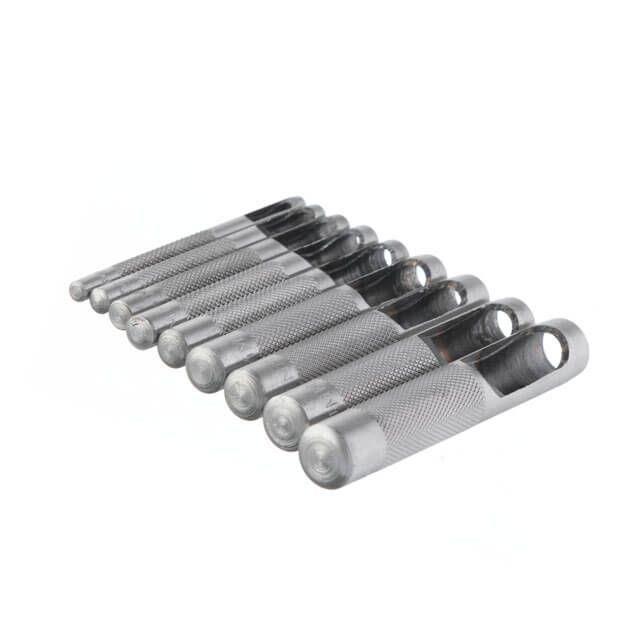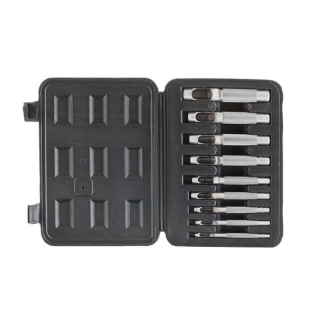 Набір просічок використовується для висікання рівних, акуратних круглих отворів у листовому металі, гумі, пластику, шкірі, картоні та інших м’яких матеріалах. За допомогою них виконують отвори під кнопки, шнурівку, заклепки тощо. У комплекті найпопулярніші діаметри для отворів: 3, 4, 5, 6, 7, 8, 9, 10, 12 мм.