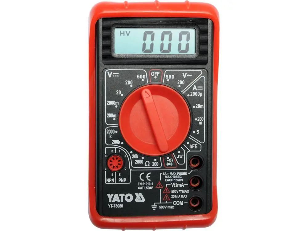 Мультиметр YATO YT-73080 – цифровий вимірювальний пристрій, який призначений для вимірювання різних електричних величин. Мультиметр має пластиковий корпус, рідкокристалічний дисплей, перемикач вимірювальних діапазонів. В корпусі встановлені вимірювальні гнізда, а також гніздо для перевірки транзисторів. Пристрій поставляється з вимірювальними проводами зі штирями на кінцях.