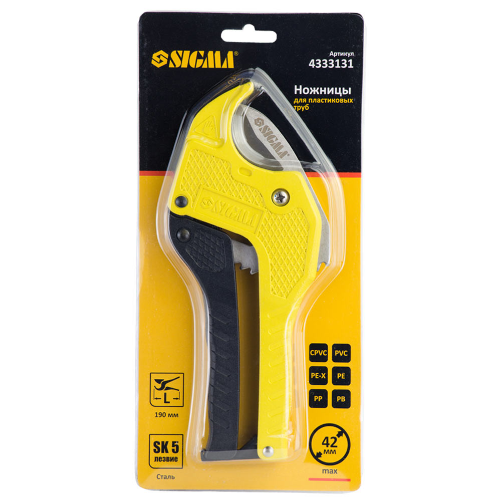 Ножиці для пластикових труб 0-42мм 190мм (сталь SK5) SIGMA (4333131) призначені для різання металопластикових труб максимальним діаметром 42 мм при монтажі водопровідних і опалювальних систем. Характеристики: Сталь SK 5 Прямое лезвие
