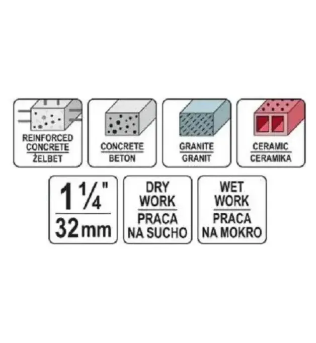 Корончате свердло YATO YT-60375 для бурової установки, призначене для роботи без удару – всуху і мокру – з буровою установкою (наприклад, YT-81980). Воно дозволяє швидко і точно свердлити отвори, у тому числі без штатива, в залізобетоні, бетоні, силікаті, наприклад, для електричних коробок, свердлити стелі для труб і кабелів, прокладати кабельні траси або вентиляційні канали.