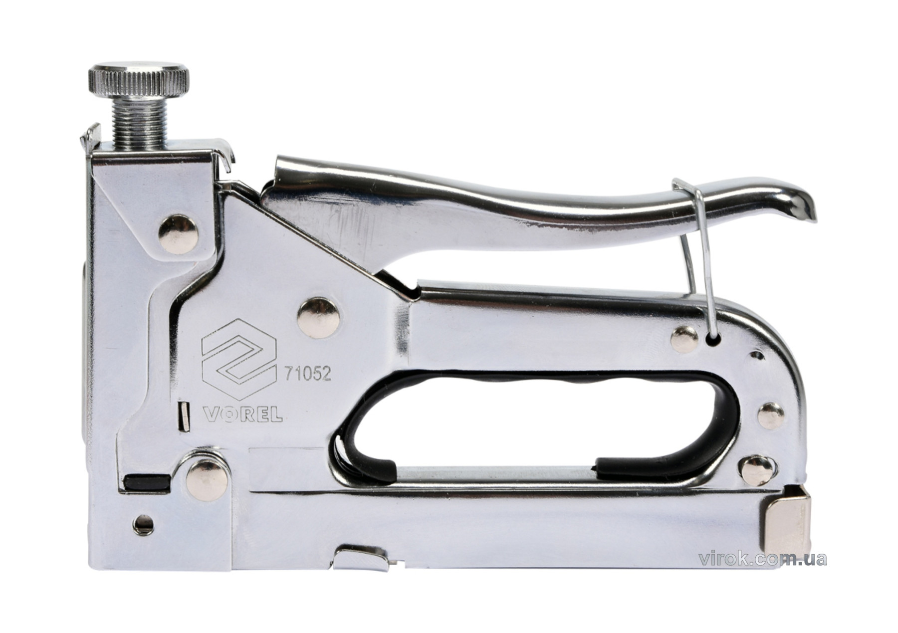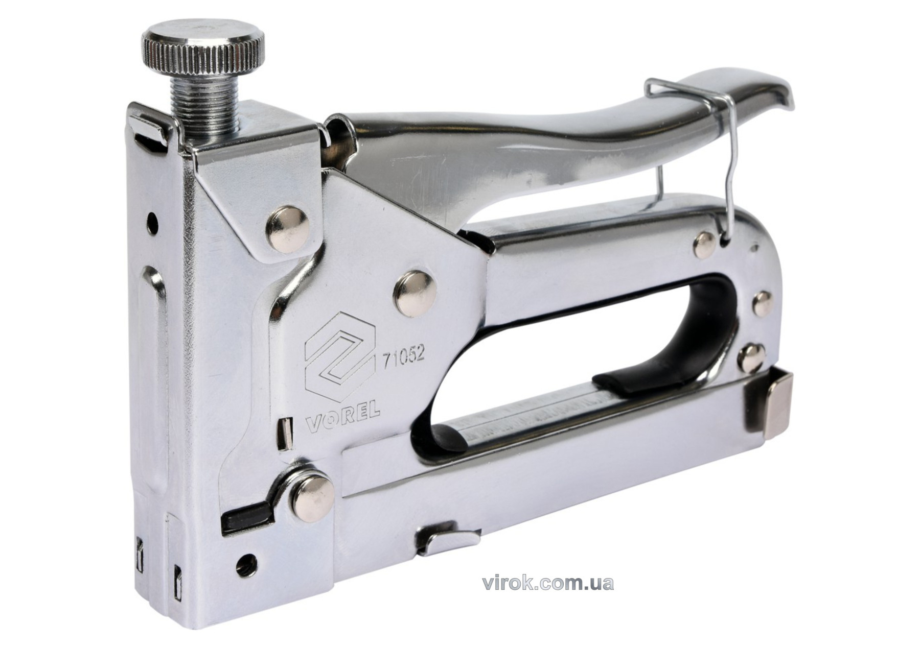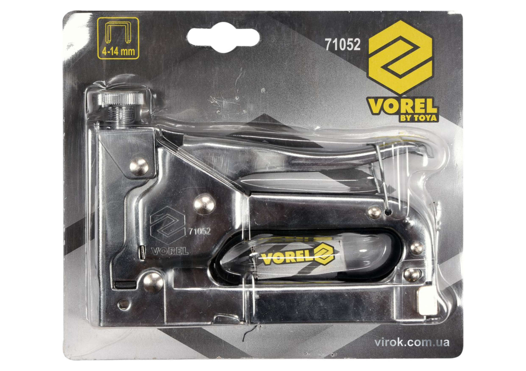 Степлер для оббивки Vorel 71052. Степлер для оббивки призначений для швидкого з’єднання різних матеріалів, наприклад дерева з тканиною, картоном, папером або шкірою. Використовується для оббивки, покрівлі, декорування, оздоблення будівель тощо. З’єднує матеріали за допомогою сталевої скоби, вбитої з великою силою. Степлер призначений для забивання типових сталевих прямокутних скоб довжиною від 4 до 14 мм. Степлер з регульованим тиском бойкової пружини – регульована сила удару.
