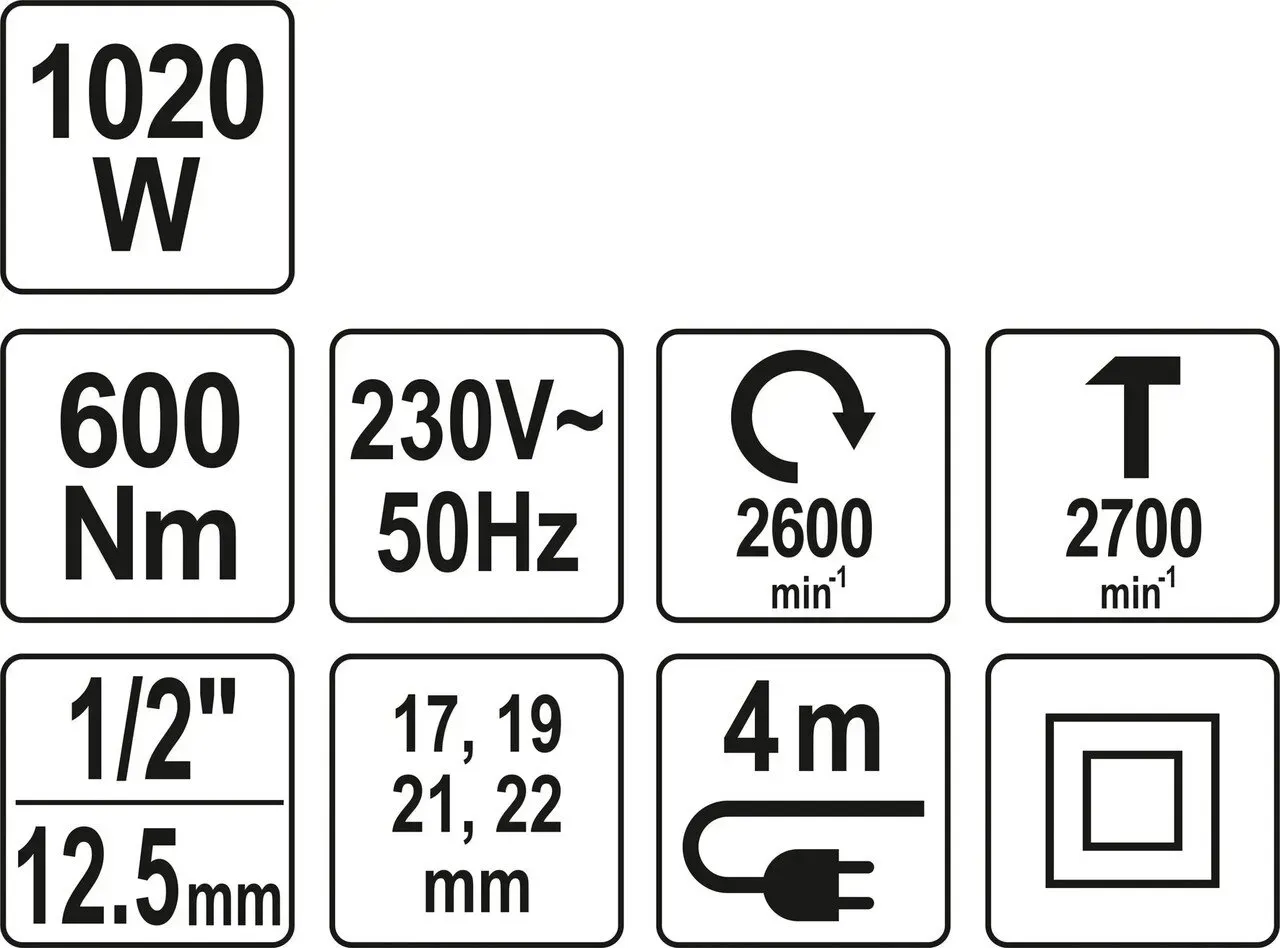 - У комплекті: валіза для транспортування, ударні головки: 17 мм, 19 мм, 21 мм і 22 мм.