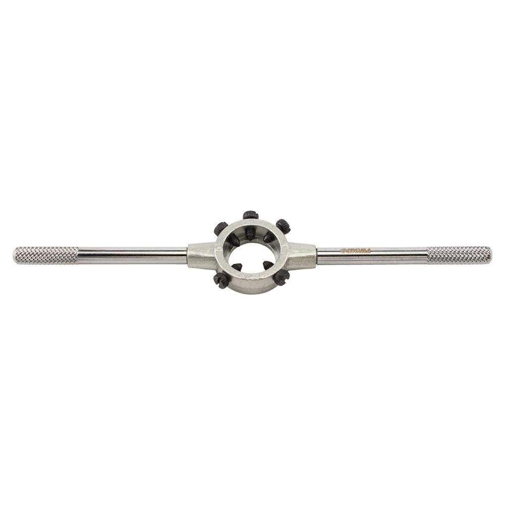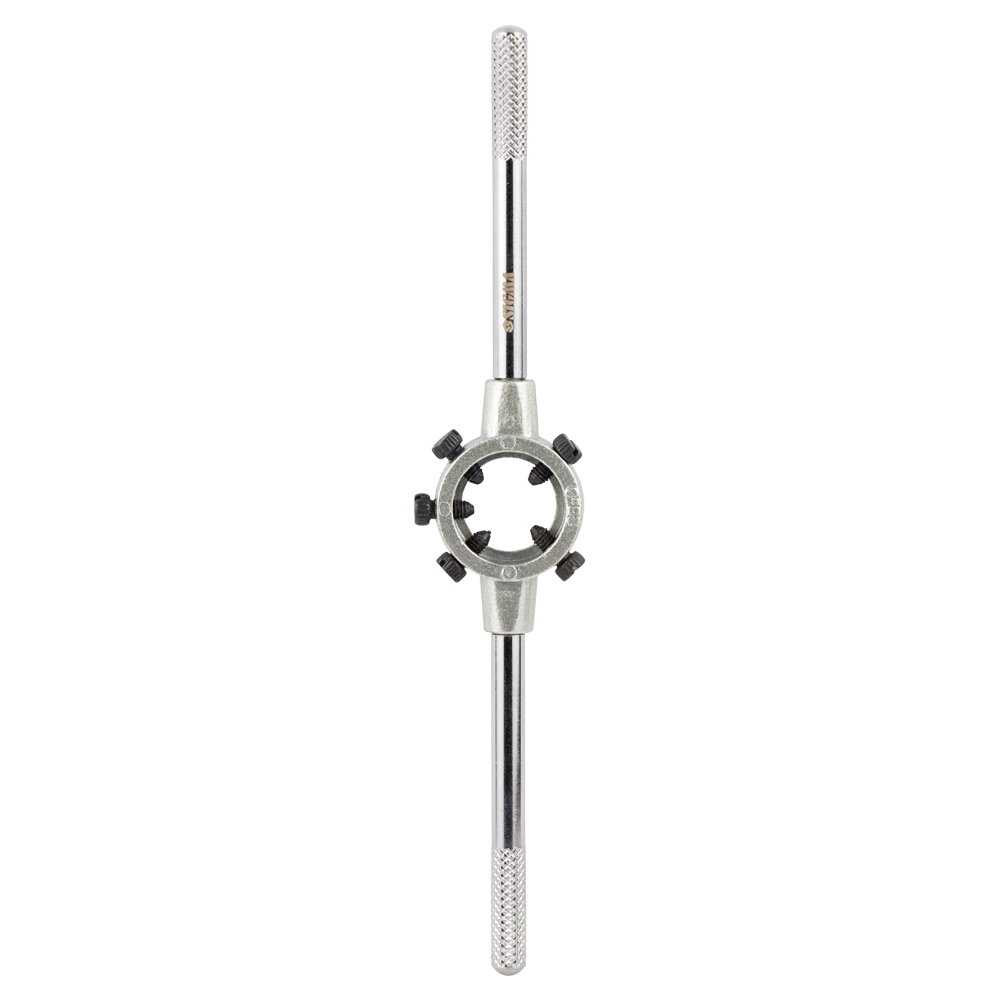 Особенности: Съёмные удобные рукоятки для компактного хранения; Надежная фиксация; Болты для зажима; Рифленые поверхности на ручках держателей для предотвращения проскальзывания инструмента; Простота конструкции; Для плашек стандартных размеров М8.