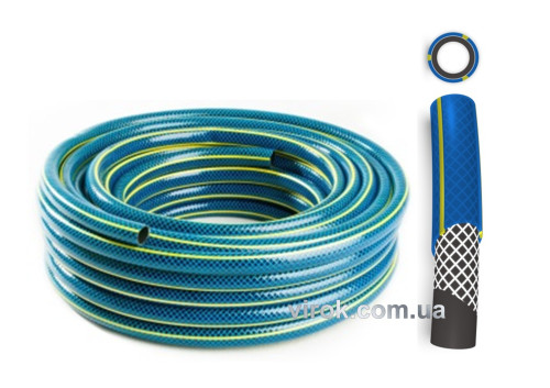 Шланг садовий, зроблений з еластичного ПВХ на основі суспензійного полівінілхлориду, терефталата та інших компонентів, зміцнених текстильною оболонкою.