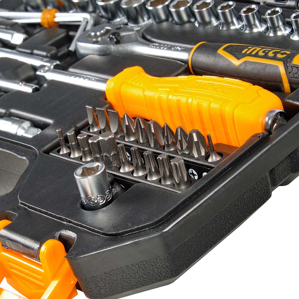 У набір входить: тріскачкове руків’я 45T (1 шт), торцеві головки (13 шт), карданний шарнір (1 шт), подовжувачі (2 шт), ручка обертання (1 шт), біти для викрутки (20 шт), тримач для біт (1 шт), подовжувач (1 шт), комірець Т-подібний (1 шт), шестигранники (4 шт).