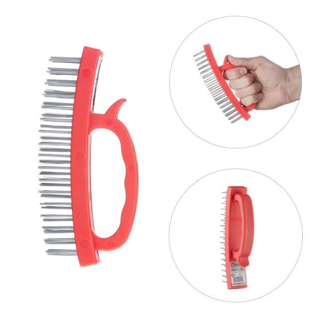Щітка виготовлена зі сталевого високоякісного дроту, розташованого в декілька рядів. Ручка виготовлена з пластику, її зручно тримати та керувати процесом зачищання. Упор під великий палець у конструкції забезпечує зручність та кращий контроль над робочим процесом.