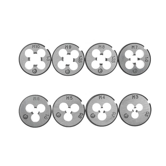 - Плашки: М3х0.5, М4х0.7, М5х0.8, М6х1.0, М7х1.0, М8х1.25, М9х1.25, М10х1.5; М12х1.75;
