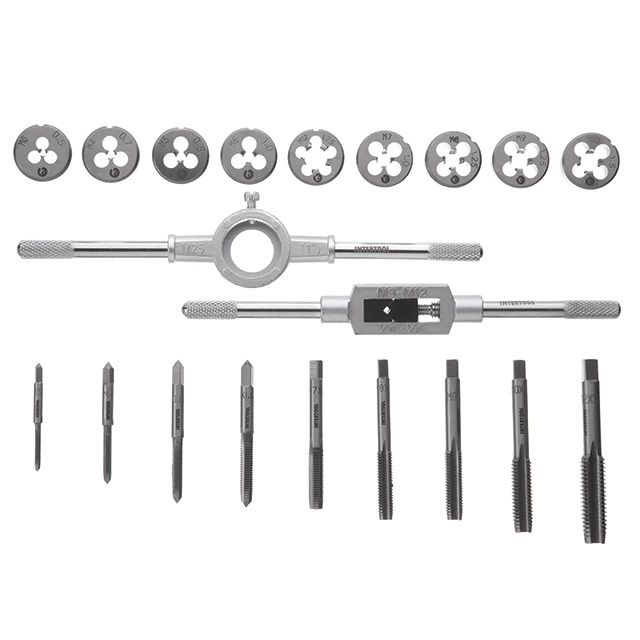 - Розміри мітчиків і плашок: М3×0.5, М4×0.7, М5×0.8, М6×1.0, М7×1.0, М8×1.25, М9×1.25, М10×1.5, М12×1.75;
