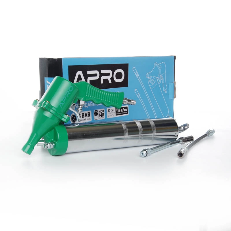 Характеристики Пістолет для видавлення змазки пневматичний 400мл, дві насадки APRO