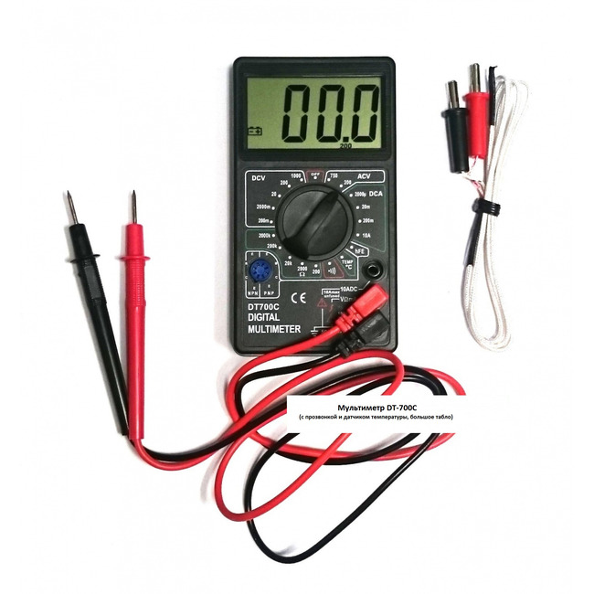 Мультиметр DT-700С – цифровий мультиметр для вимірювання постійної та змінної напруги, постійного струму, опору та температури (вбудований термометр з термопарою К-типу), має функції перевірки діодів, транзисторів, забезпечений звуковим пробником (продзвінком).