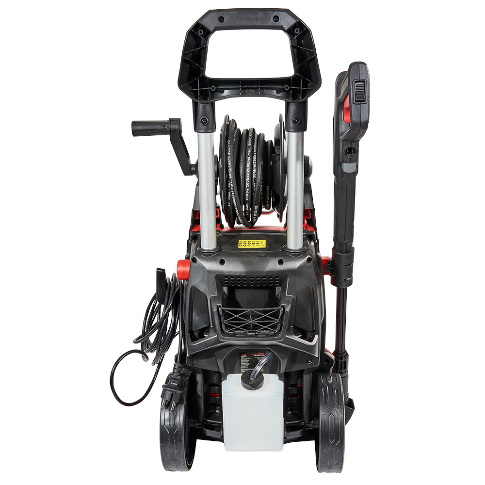 Приводний електродвигун і насос високого тиску об’єднані в блок. Робочий інструмент — пістолет з форсункою — під’єднаний до насоса довгим семиметровим шлангом високого тиску з металевим обплетенням. Щоб шланг не займав занадто багато місця, не заважав роботі й переміщенню, мийка оснащена спеціальною котушкою для намотування шлангу. Для зручності переміщення мийка оснащена колесами та телескопічною ручкою.