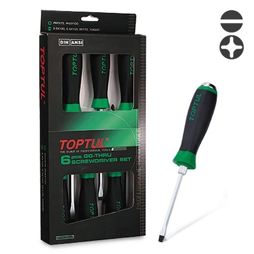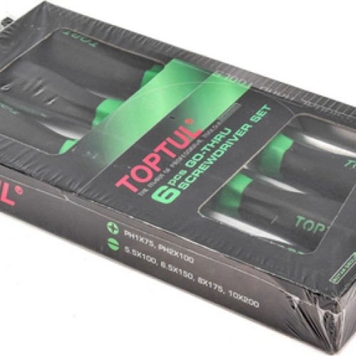 У виготовленні ударних викруток TOPTUL використовується високоякісний сплав хром-ванадієвої сталі і спеціальне магнітне напилення на кінці викрутки для більшої зручності в роботі. Наскрізний стрижень ударної викрутки витримує середньої сили навантаження для вивільнення кріплення, що заклинило. Рукоятка викрутки виготовлена ​​з ергономічного прозорого пластика, що дозволяє забезпечити надійне захоплення і запобігти ковзанню під час роботи. Всі викрутки TOPTUL відповідають світовим стандартам якості і відомі своєю надійністю і довгим терміном експлуатації.