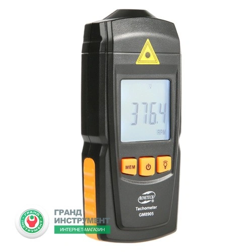 Цифровий оптичний тахометр GM8905 виробництва компанії Benetech. Технічні характеристики даного безконтактного тахометра дозволяють проводити вимірювання обертання деталей механізмів і машин в діапазоні від 2,5 до 99999 оборотів в хвилину. Відмінною рисою GM8905 є висока точність і змінюваний дозвіл вимірювання (0,1 – 1 об. / Хв). В основу вимірювання швидкості обертання покладений принцип підрахунку кількості імпульсів відбитих від обертової мітки за одиницю часу. В комплект поставки включені світловідбиваючі смуги. Безконтактний тахометр часто застосовують для контролю оборотів колінчастого вала двигунів, або частоти обертання механізмів технологічних машин і агрегатів. Також до особливостей лазерного тахометра GM8905 Benetech можна віднести можливість точного вимірювання частоти обертання на відстані до 500 мм. Розширена функціональність даного оптичного тахометра дозволяє зберігати дані вимірів, фіксувати мінімальні і максимальні значення, а також відображати середнє значення вимірювань. Зручність вимірювання забезпечується автоматичним утриманням даних на дисплеї з яскравим підсвічуванням. Тривалу роботу лазерного тахометра забезпечують два елементи живлення 1,5 В типорозміру “ААА”. Для економії енергії батарея GM8905 оснащена функцією автоматичного відключення живлення при тривалій бездіяльності приладу. Переваги та особливості оптичного безконтактного тахометра Benetech GM8905: 1. Головною перевагою даної моделі є підвищена надійність. Якщо порівнювати цю модель з іншими популярними тахометрами, представленими на ринку України в даній ціновій категорії, то в першу чергу потрібно відзначити якість збірки моделі GM8905. Корпус виконаний з високоякісного пластику, деталі корпуса ідеально підігнані, що дозволяє тахометру витримувати умови запилених приміщень робочих цехів, а також підвищену вологість і вібрацію. 2. Другою особливістю даної моделі є висока точність вимірювань. 3. Автоматичне відключення живлення після 5 хвилин бездіяльності 4. Утримання максимальних, мінімальних і поточних значеній 5. Індикація низького заряду батареї 6. Яскраве підсвічування екрану