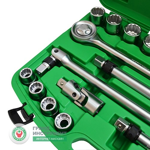 В даний набір включені: 16 торцевих 12-гранних головок від 19 до 50 мм, два подовжувача з фіксацією розміром 200 і 400 мм, кардан, вороток з шарніром з фіксацією і тріскачка на 43 зубця з круговим перемикачем.