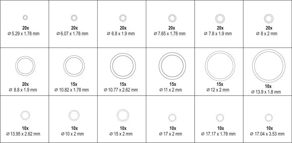 Набір ущільнювальних кілець YATO YT-06879 характеризується високою стійкістю до озону, дизельного палива, мінеральний мастил, олії рослинного або тваринного походження, легких паливних масел, емульсії масло-у-воді типу HSA, HSB, аліфатичні вуглеводні, такі як бензин, пропан-бутан, розбавлені кислоти, луги і солі (навіть при підвищених температурах.) кислих газів суміші гліколів з водою до 150°С.