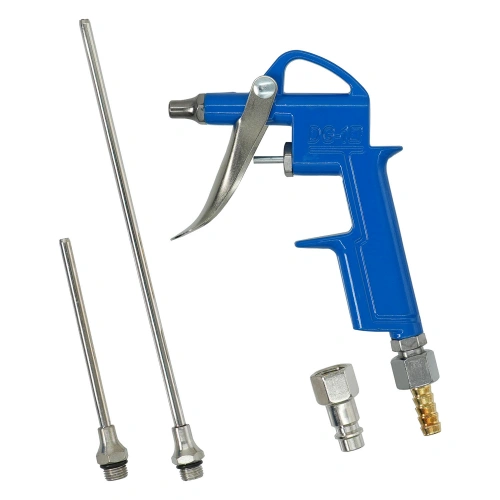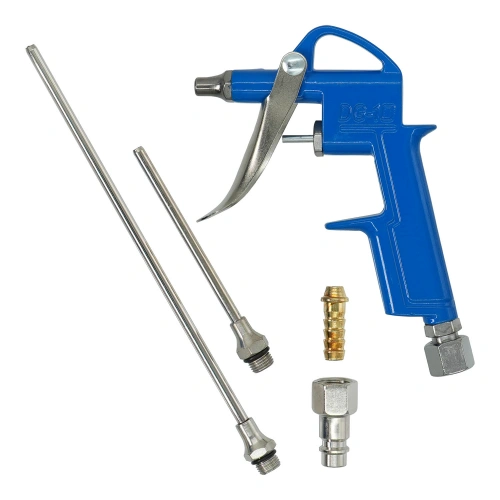 6.2 БарПродувний пістолет з комплектом насадок 15, 95, 190 мм AIRKRAFT DG-20 – універсальний пневмоінструмент для очищення важкодоступних місць від пилу, стружки, тирси та інших забруднень. Постачається з трьома змінними подовженими насадками (15, 95 та 190 мм), що дозволяють працювати як у відкритих зонах, так і у вузьких або глибоких отворах. Корпус виконаний із міцного металу, а ергономічне руків’я забезпечує комфорт під час тривалої роботи.
