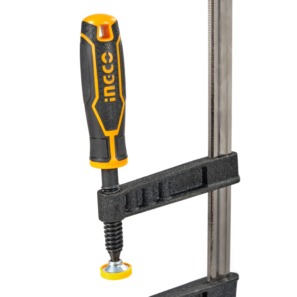 Струбцина столярна тип-F 120х300 мм INGCO INDUSTRIAL призначена для стиснення між собою або закріплення на робочому столі деталі великих розмірів із пластику, деревини або металу.