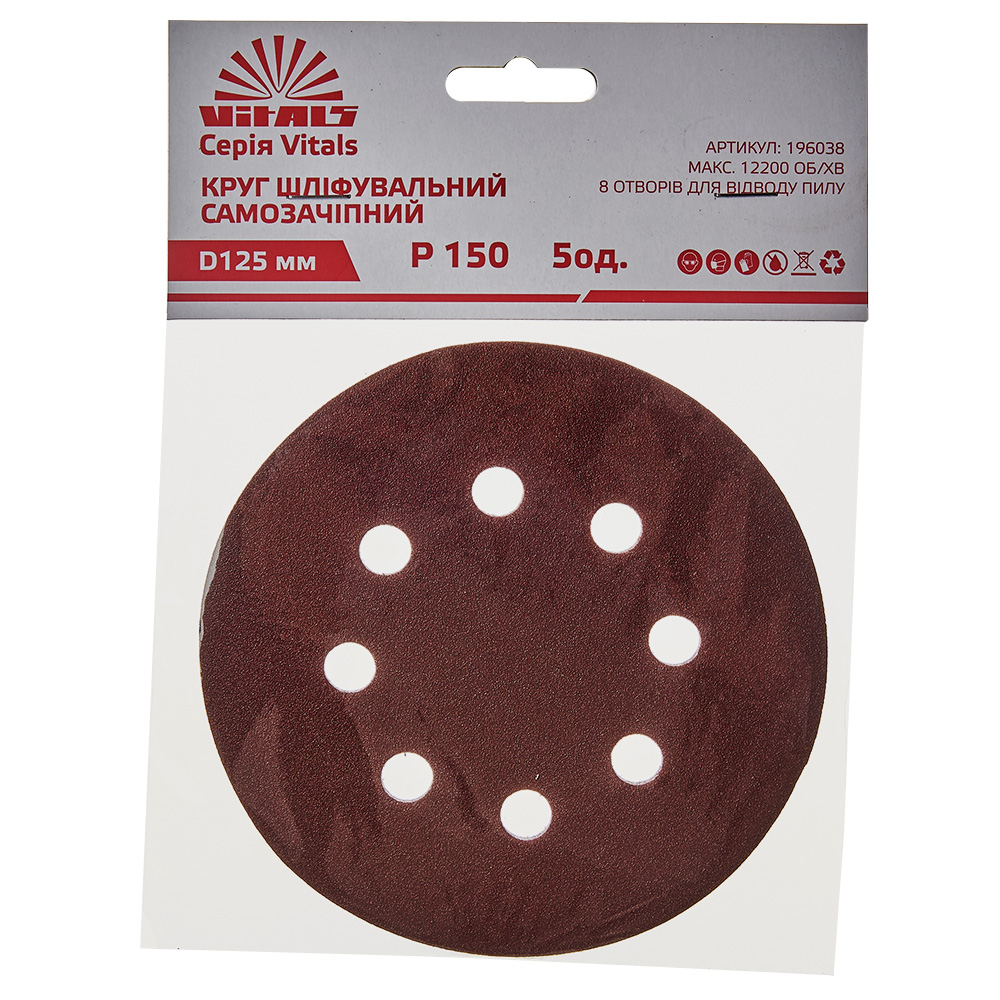 Характеристики на Круг шліфувальний самозачіпний Vitals 125 мм 8 отв з. 150, 5 шт.