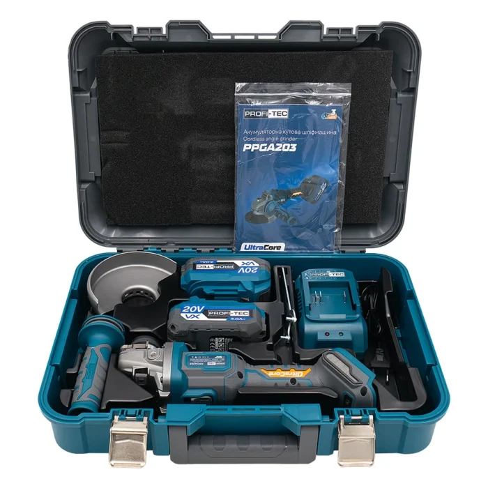 ГоловнаІнструменталкаакумуляторні болгаркиАкумуляторна кутова шліфмашина PROFI-TEC PPGA2032хPT2040VX, зарядний BC20V, Кейс 007640