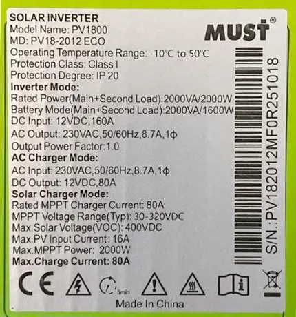 Гібридний інвертор MUST PV18-2012ECO — це професійне рішення для створення ефективної системи енергопостачання, яке забезпечує надійність, гнучкість конфігурації й оптимальне використання сонячної енергії в різних умовах експлуатації.
