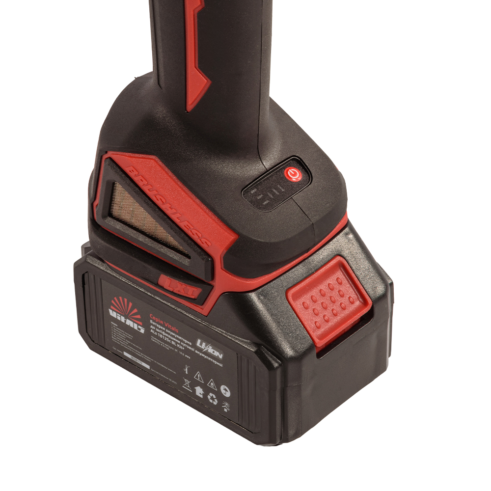 Шліфмашина кутова акумуляторна ТМ «Vitals», серія «Master», модель «ALs 18125c BL» виготовлена із дотриманням усіх вимог безпеки та є надійним інструментом для побутового використання. Вона призначена для шліфування, різання та зачищання металевих виробів за допомогою абразивних дисків. Принцип роботи базується на перетворенні електричної енергії на обертальний рух шпинделя, на який кріпляться змінні насадки. Конструкція включає безколекторний двигун, конічний одноступеневий редуктор у металевому корпусі, а також ергономічне подовжене руків’я з можливістю приєднання акумуляторної батареї.