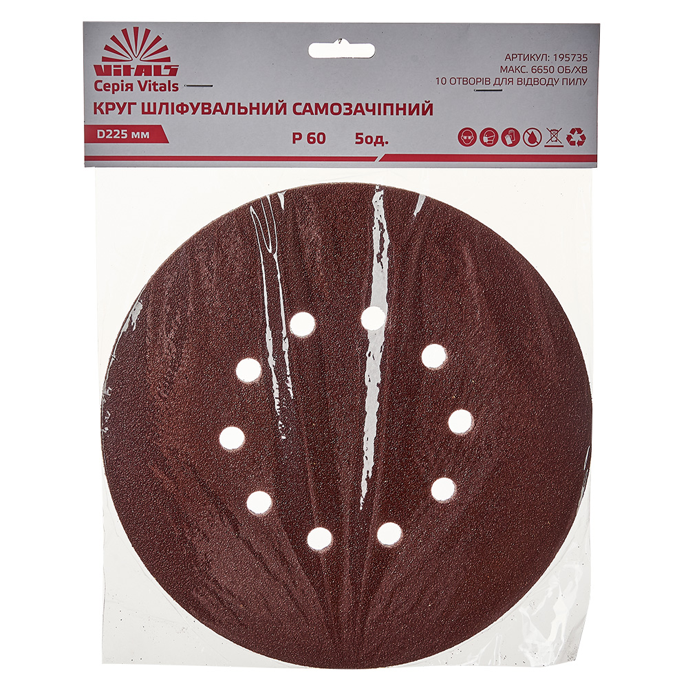 Опис круга шліфувального самозачіпного Vitals 225 мм, 10 отв., з. – 60, 5 од.