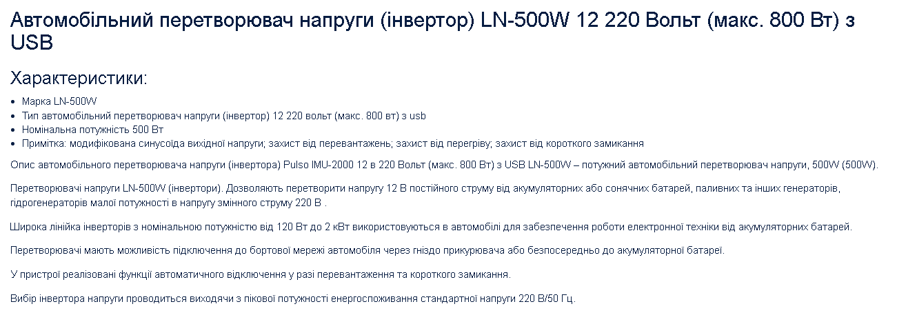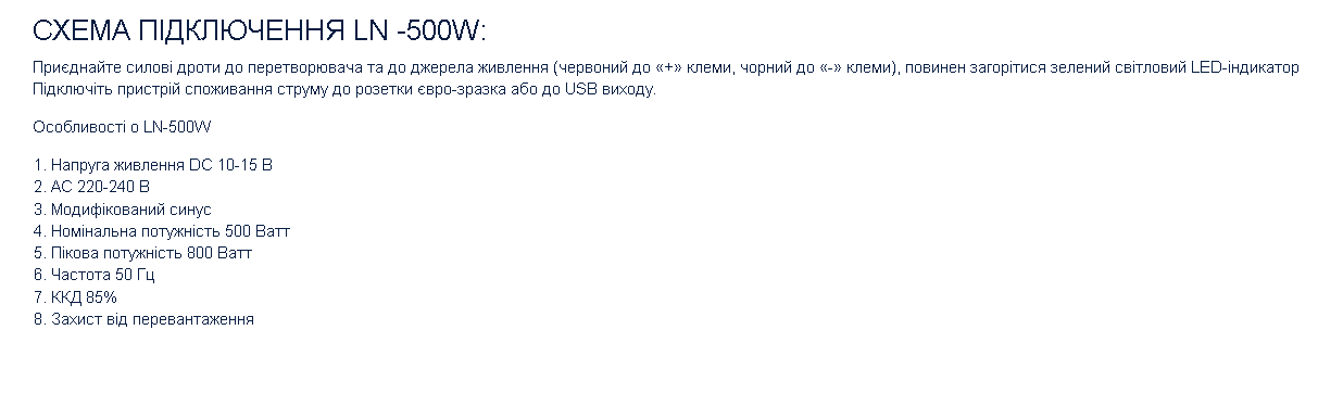 Будьте першим, хто залишив відгук на “Перетворювач напруги 12V-220V 500W/MAX800 Rohs o LN Lmar LN122-500”