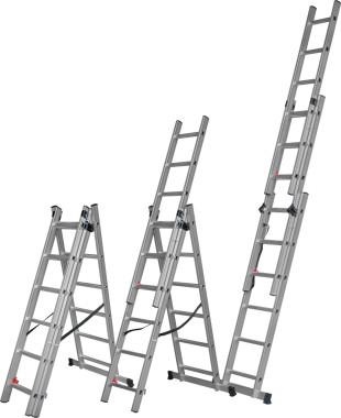 Завдяки трисекційній конструкції (3 секції по 8 сходинок), драбина може використовуватися в різних конфігураціях: як приставна драбина максимальної довжини 506 см, як двостороння стрем’янка або в інших комбінаціях залежно від ваших потреб. У складеному вигляді її довжина становить лише 226 см, що робить зберігання зручним навіть в обмеженому просторі.