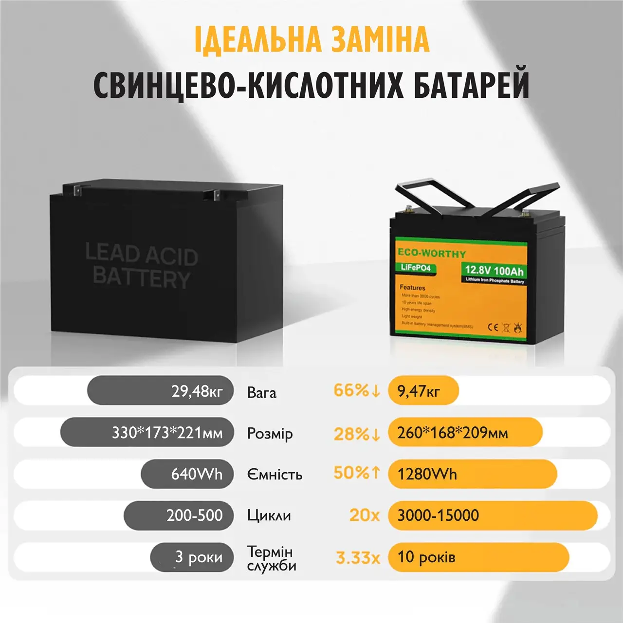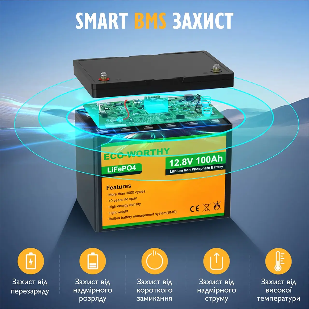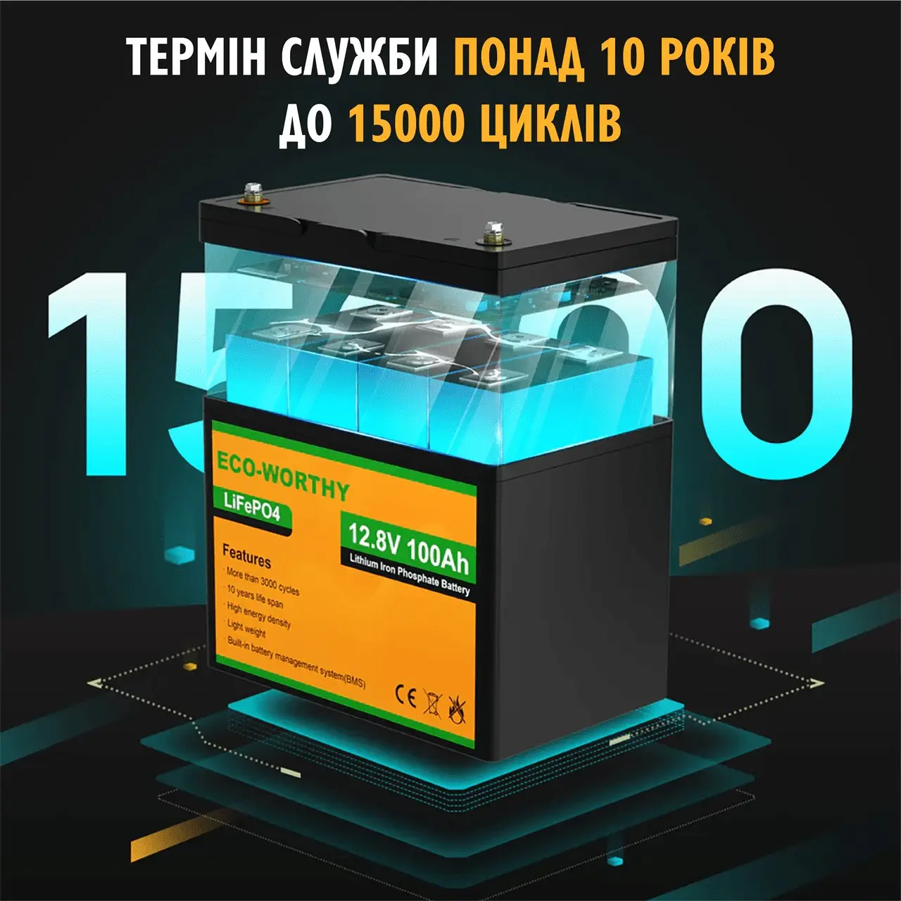 Акумуляторна батарея ECO-WORTHY LiFePO4 12V 100Ah – це літій-залізо-фосфатний акумулятор з BMS, до 15 000 циклів глибокої зарядки, для автофургонів, кемпінгу, морського транспорту, тролінгового двигуна, ДБЖ (UPS), автономної сонячної домашньої системи.