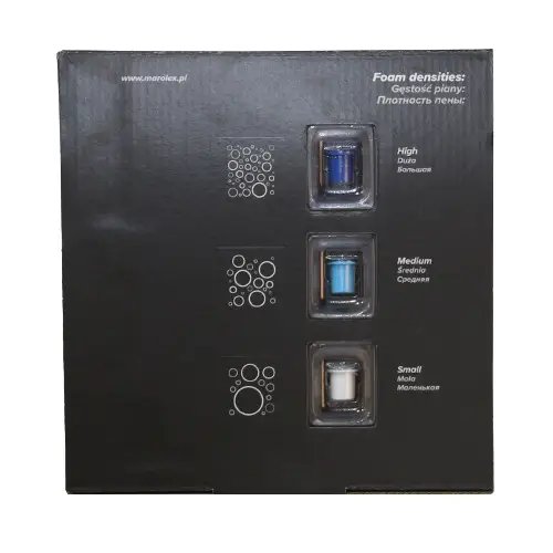 Три змінні піноутворюючі вставки виробляють піну різної щільності. Достатньо просто замінити вставку, щоб з рідкої піни, що ідеально підходить для проникнення в порожнечі, отримати щільну піну, настільки густу, що вона тримається на майже вертикальних поверхнях.