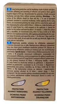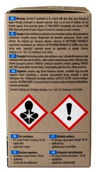 K2 LAMP PROTECT – довговічне захисне покриття для фар із пластику та скла. Запобігає пожовтінню та тьмянінню ламп. Захищає від шкідливого впливу УФ-променів. Зберігає поверхню лампи чистою, відштовхуючи воду та полегшуючи видалення бруду. Захищає фари від легких подряпин.