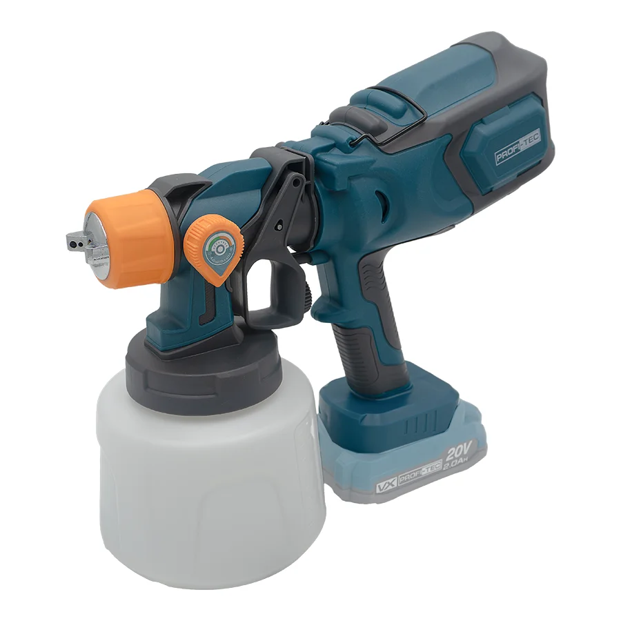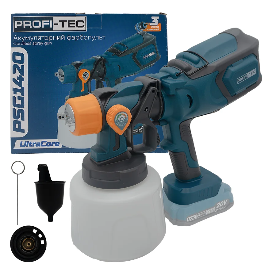 Акумуляторний фарбопульт PROFI-TEC PSG1420 – універсальний інструмент для швидкого та якісного нанесення лакофарбових матеріалів, ґрунтовок, морилок, лаків, фарб для деревини та металу, засобів захисту поверхонь та інших водорозчинних і розчинникових лакофарбових матеріалів на поверхнях різної складності.