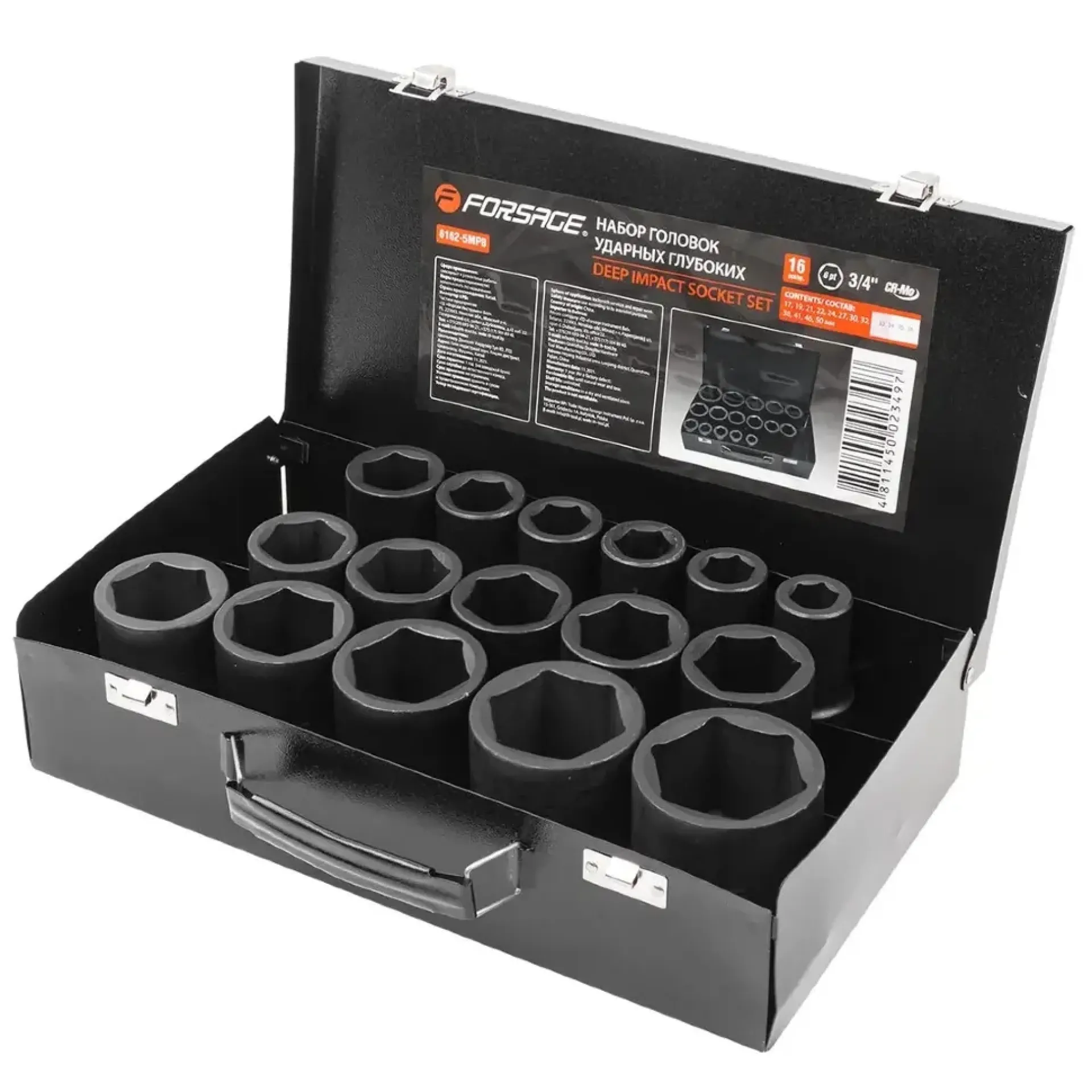 ГоловнаІнструменталканабори головокНабір ударних головок глибоких 3/4″ 6гр 16 пр. в кейсі//Forsage F-6161-5MP/18087